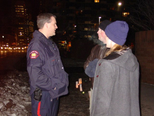 之后,一名警察也来到了烛光守夜的现场。据他介绍,他们是接到了中领馆的请求而来的。但他表示,“我不相信法轮功学员的活动影响了中领馆的尊严。” 并对法轮功学员表示了同情。借此机会,法轮功学员向他反映,中领馆最近在室外又安装了两部摄像机,用来监视和平请愿的法轮功学员,已经对他们的安全构成了威胁,有些学员因此而被跟踪。对此,这名警察建议法轮功学员可以向市政府反映情况。