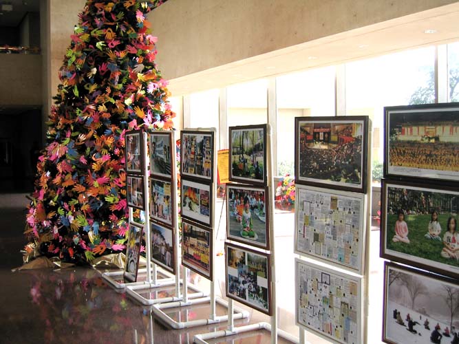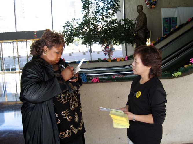 从图片中,人们看到了大法洪传世界的殊胜景象,看到了大法带来的祥和、宁静,同时镇压者的残暴也暴露无遗,引起人们的气愤。几乎所有经过这里的人们都接受了学员们递上的材料并在营救李祥春的明信片上签名。有的当场仔细地阅读传单,了解真相,更有一位女士还告诉我们她早就知道了有关李祥春医生的故事,这次她不仅自己签了名,还向学员索取了更多了的明信片,说想让她的朋友们帮助营救李祥春医生。