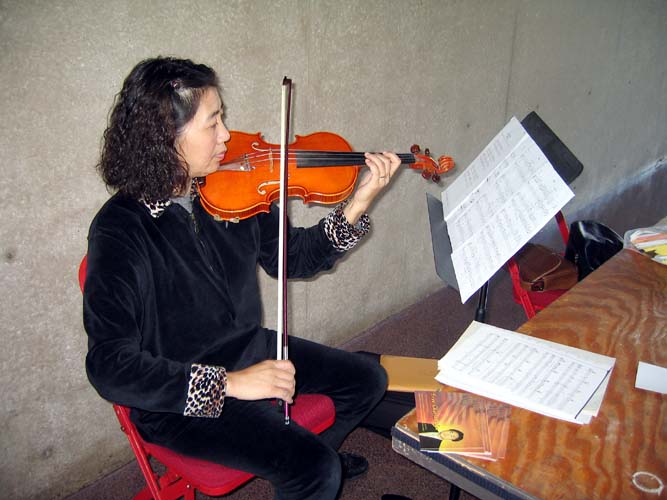 | 一位女士在签营救李祥春的卡片 | 一位学员在演奏普度、济世 |