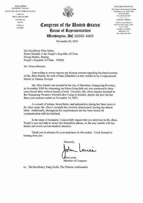 路易斯议员在致温家宝的信中说,周雪菲是乔治亚州亚特兰大市我选区内的居民吕朝晖的妻子。周雪菲女士于2000年11月在广东省深圳市为实践她对法轮功的信仰而被捕,在未经审判的情况下被劳教3年。目前,周雪菲女士仍然被关押在位于三水市的广东省妇女劳教所,尽管她的3年劳教期已于2003年11月14日期满。