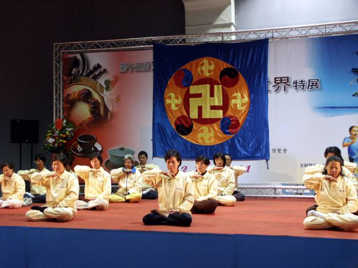 | 法轮功的展位 | 十九日上午法轮功学员在舞台上展示全部五套功法 |