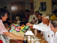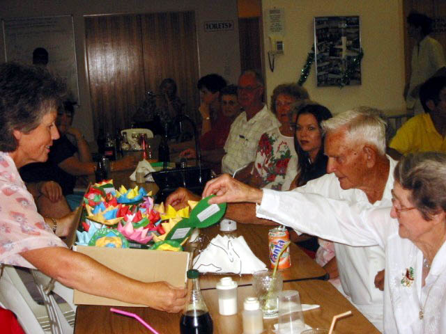 阳光海岸的学员们还折叠了精美的莲花,分别赠送给在场的每一位老人。主持人还利用联谊会的机会向所有与会者介绍了“和平的花瓣”活动,告诉人们一个来自中国的澳籍小姑娘法度的父亲因坚持修炼法轮功在中国被致死的情况,小法度跟着妈妈奔走于世界各地,呼吁善良的人们协助制止这场发生在中国的迫害,并希望全世界所有的孩子都能生活在公正,和平,幸福的环境中。老人们聚精会神地听着,思索着,翻阅着手中的真象资料。