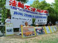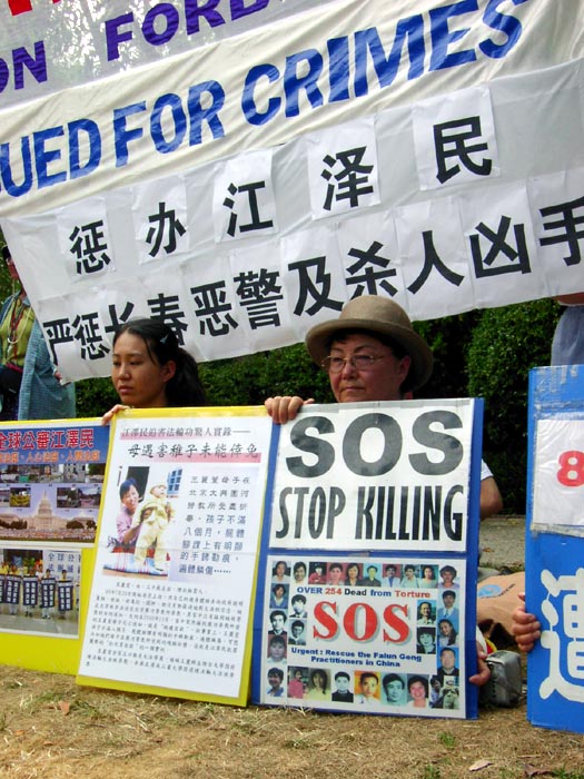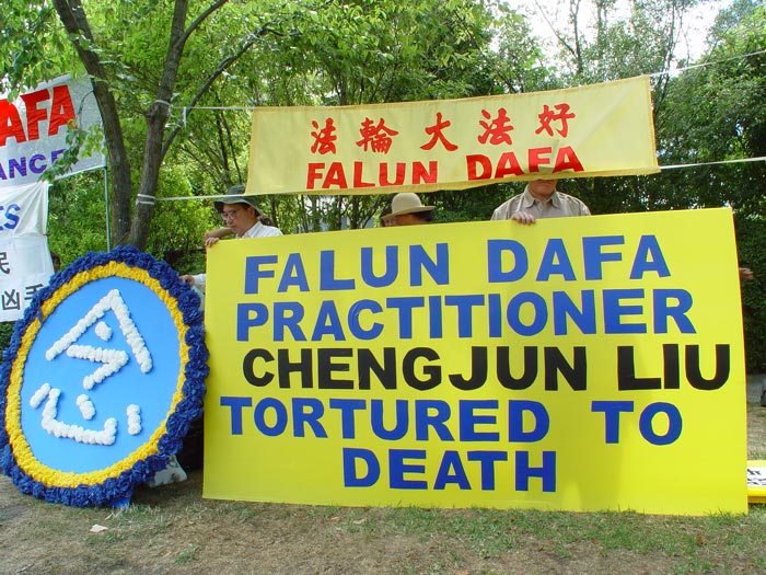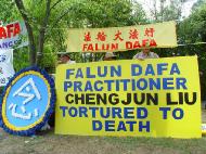 | 英文横幅:“法轮大法修炼者刘成军被虐杀” | 中文横幅:“严惩江泽民 严惩长春恶警及杀人凶手” |