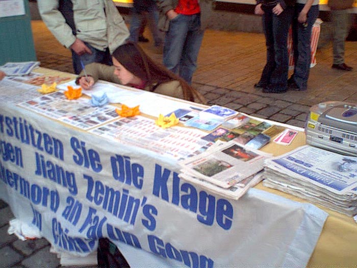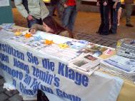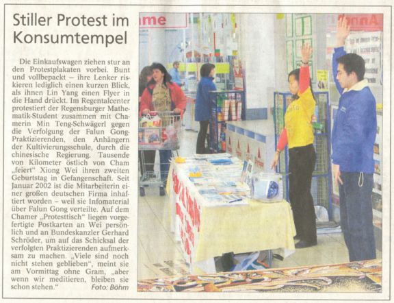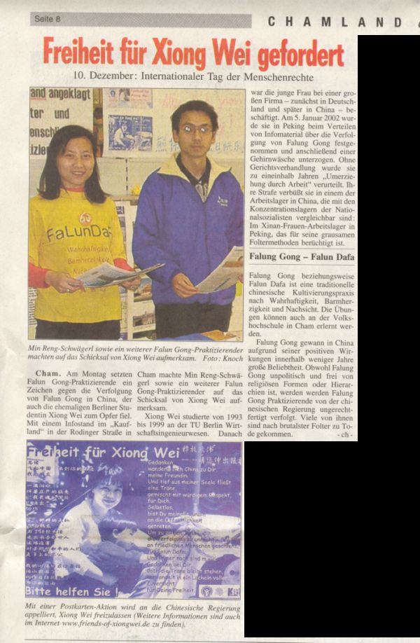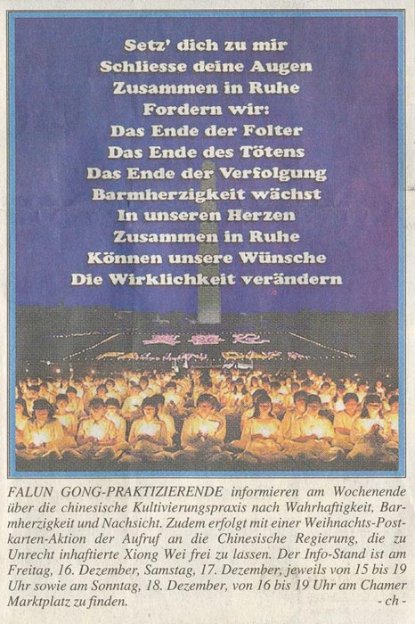 媒体的报道让许多人了解了真相,紧接着的周末,我们又在市中心申请了举办营救熊伟的活动。并在圣诞来临之际,办了一次为寄给熊伟的圣诞卡征集签名的活动。一朵纯净的莲花和学员为熊伟生日写的诗--就像莲花,7月华盛顿法会学员烛光组字--法正天地的照片,还有我们的祝福和很多关心熊伟命运的人们的签名一同寄向北京新安女子劳教所。对圣诞卡活动,当地报纸也做了提前通告,并附上了2002年大法学员在华盛顿烛光组字:“FALUN DAFA”、“真善忍”的照片和“请与我同坐”的诗(德文)。