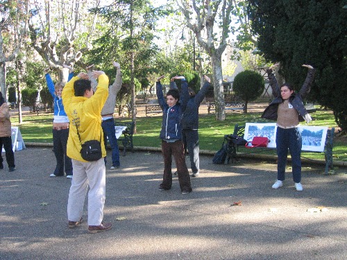 一大早,大法学员们来到了市中心的La Alamedilla公园演示功法并义务教功。很多在公园散步的游人立刻被这新奇而又美好的功法所吸引,停下脚步凝神欣赏着这柔和优雅的功法和美妙动听的音乐。过往的人们欣喜地接受了大法资料并主动和学员们攀谈以进一步了解法轮功。很快就陆续有人表示希望学习功法。由于先后不断有人加入炼功队伍,所以当第一批教功结束后,马上又开始了第二轮的教功。有些已参加了第一批炼功的人似乎感受到了法轮功的深奥及珍贵,所以他们又特地留下来参加新一轮的炼功直到教功结束。