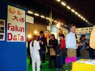 由于展品都是生物食品和手工作品,来参观的人大都是喜欢自然和天然之物者,或是一些有着各种健康等方面问题者。总之,大多数人来此,都是来寻找他们想要的东西的。所以,我们有机会和很多的人作了深入的交谈,我们也遇到了很多有缘人。学员们都感觉到,在这种环境下,人们往往有更多的耐心来听我们讲,也愿意提问题。有的人在展台旁与我们的学员谈了一个多小时后心情舒畅又意犹未尽地离开;有的在我们的展台内和我们学功法;有几个参展的摊主连续几天在开展前和我们学员一起炼功。