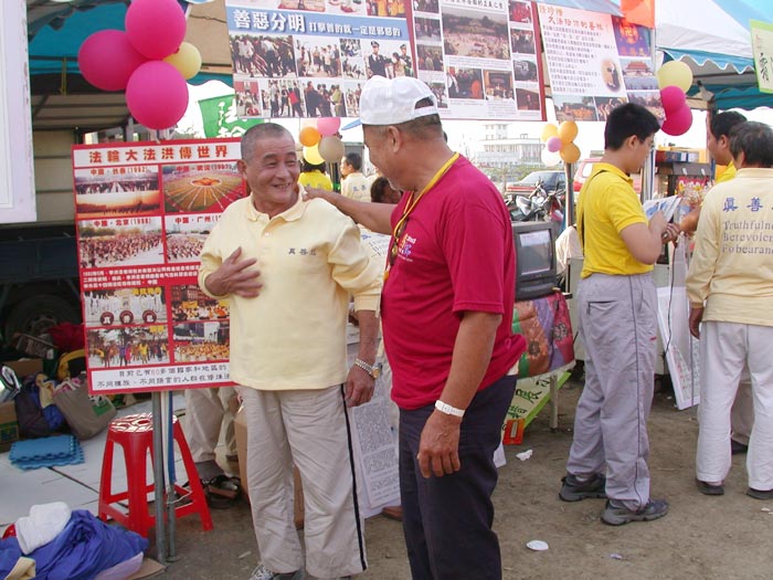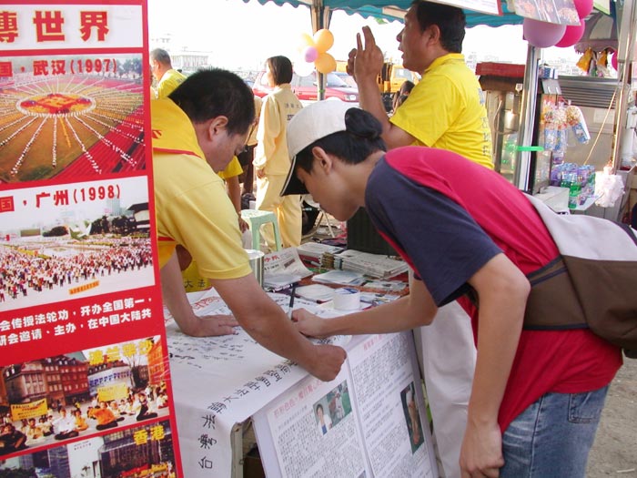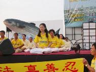 在下午4点30分,约有五十几位同修在舞台上演示五套功法,并简介大法的特色,当炼功音乐响起时,整个空间场,呈现一片肃穆、庄严、祥和。