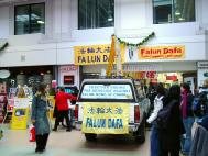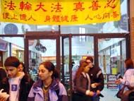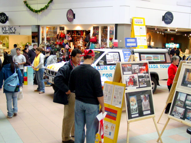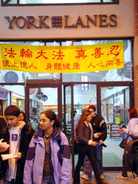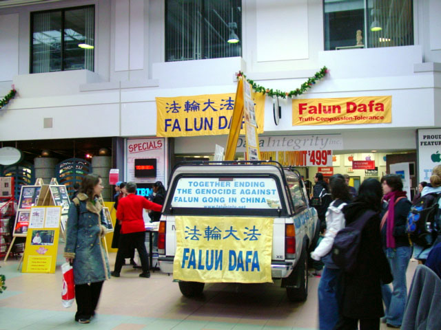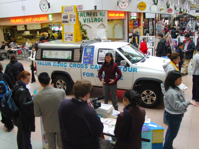 我们将车开到了购物中心的中心位置,并在周围的墙上将法轮大法的横幅高高挂起。大学的购物中心里有许多中国学生,他们大部分都接受了我们的材料。国际大赦的主席还就中国的人权问题发表了演讲,大学的其他代表们也表达了对我们的支持。