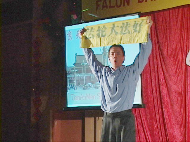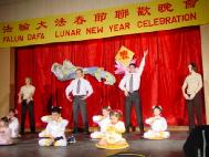 晚会的节目丰富多彩,除了歌唱、民族和古装舞蹈等各式传统中国节目外,还有西人法轮功学员为观众献上的中文歌曲――“拜年歌”和“为你而来”。一位西人学员――加拿大著名演员麦克尔.莫侯南自编自导了一出哑剧,和几位中国学员一起用表演的形式向观众展示了一个西方年轻人的生命历程:从迷茫困惑的人生通过大法修炼走向了新的生活,当知道自己的同修在中国因为修炼真、善、忍而遭到迫害后,他走上街头,分发传单,告诉大家迫害的真实情况。最后远到中国去告诉可贵的中国人西方人对法轮功的珍惜,并走向了天安门,在广场上大声喊出他的心声“法轮大法好”!整个哑剧以这发自内心的呼喊结尾,赢来了满场观众的掌声。