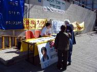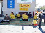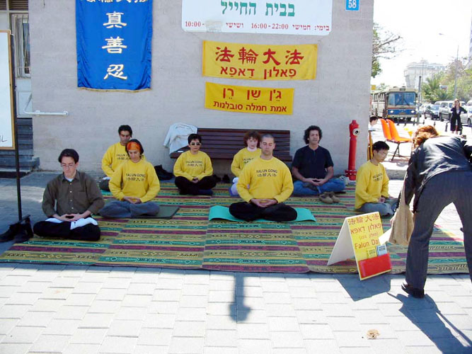 许多法轮功学员来到挂着大法旗帜的街角,有的炼功,有的发正念,有的坐在真相材料桌旁向路人分发中国迫害大法的资料。许多人要求在请愿书上签名,帮助停止迫害并释放以色列公民的妹妹熊伟。熊伟因为在街上发真相传单而被捕,至今已经被关押一年以上。各个社会阶层的人士询问什么地方可以炼功。其中有些人要求马上学功并购买大法书籍。
