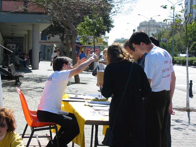 【明慧网2003年2月13日】上周五(2月7日),很多特拉维夫市居民在法轮大法学员的真相材料桌前停步,对在中国发生的镇压表示震惊并表示对在中国受的法轮大法学员表示同情。