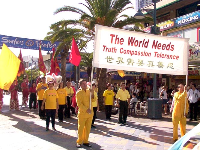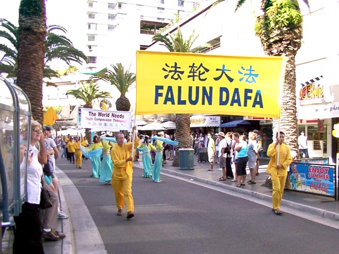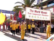 我们的阵容引人注目。前面是两名男学员高举法轮大法的横幅,随后是身着彩装的女学员随着音乐翩翩起舞,紧跟着是写着“世界需要真善忍”的大横幅,接下来是8名步行学员,身穿唐装的4名女学员终于赶上了游行队伍。我们的阵容确实与众不同,其他团体都是敲锣打鼓,锣鼓声震耳欲聋,而法轮功的队伍却是一派祥和,安宁。街边有很多人观看游行,大家都向我们招手致意,不少人举起相机拍摄我们的横幅和五彩缤纷的服装。