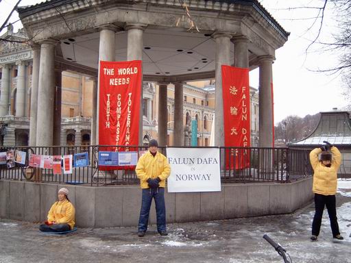 在2002年12月10日早上,学员们也在奥斯陆中国大使馆前展示他们的条幅、表演功法并发正念一个小时。同一天,诺贝尔和平奖颁奖典礼在市政厅举行。大部分参加的人都经过音乐亭。