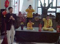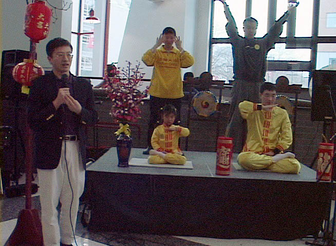 下午2时,主持人邀请我们到主席台做功法演示。我们两位弟子演示动功,两位弟子(一位是小弟子)演示静功,另一位弟子做功法介绍。年轻的大学生们对这来自东方的优美宁静的功法表现出浓厚的兴趣,尤其是对年仅5岁的小弟子的打坐赞叹不已,纷纷报以热烈的掌声。