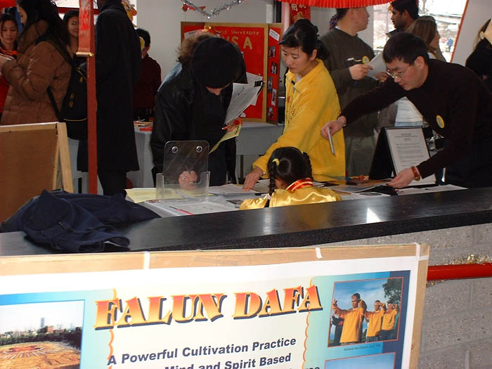 许多天普大学的学生和职员在了解了法轮功被迫害的真相后,主动来到展位前为营救Charles Li签名。征签中还发生了一个小故事。一位学生签完名后又回到展台,说刚才他用了假名也没写地址,因为怕受到不必要的干扰。但当他读了大法真相材料后,他不能容忍他刚才的做法,他说他应该做到“真”,于是就返回来重新郑重地签下了他的真名。他还告诉我们,作为犹太人的后裔,他对犹太人当年所受到的迫害印象深刻,他敬佩中国法轮大法修炼者面对残酷迫害的勇气。