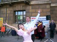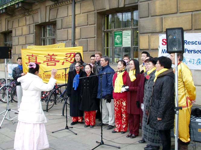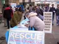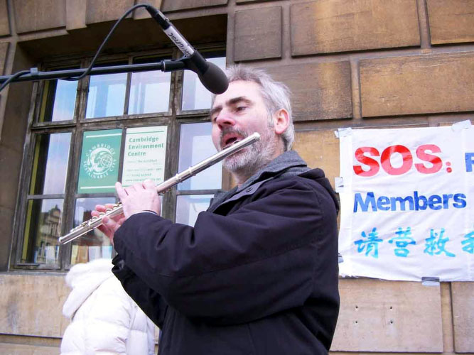 二月十五日,大法弟子又马不停蹄地把营救亲人的歌舞带到了剑桥,和有缘的剑桥人一起度过了一个特别的中国元宵佳节。营救宝莲和永洁的演出现场就设在剑桥市政府门前的空地上。“世界需要真善忍”,“紧急营救国内受迫害的亲人”的大幅横幅,数张营救亲人的大幅海报和征签桌一字排开。伴着演出,一长排的征签桌前常常挤满了签名者。两个中国小伙子一手拿着真相材料一边这样对着话,“怎么样?在国内见不到吧!”“是啊,法轮功要不好咋这么多人炼呢?”