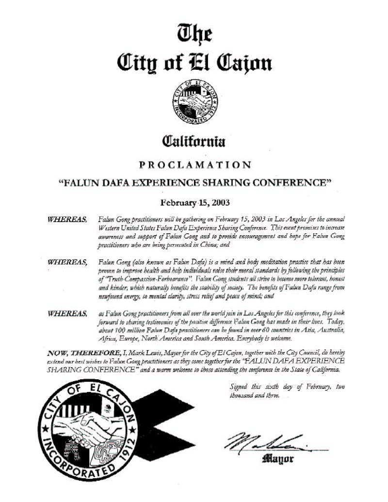 鉴于,法轮功修炼者将于2003年2月15日在洛杉矶举办每年一次的美西法轮功修炼心得交流会,这次活动会提高人们对法轮功的了解和支持,以及给予在中国受迫害的法轮功学员以鼓励;