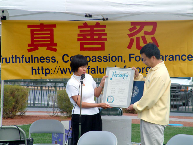 庆祝活动的当天,拉斯维加斯市晴空万里,阳光灿烂。当地和附近地区的大法弟子们在城市公园举办了首届内华达州法轮大法月活动;大家在经过连日阴雨洗礼的草地上炼功,宣读政府官员的嘉奖令和贺信。