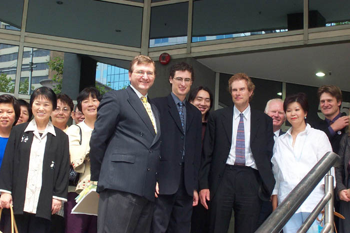 | 原告方律师厄文(前排左一)与墨尔本部分法轮功学员 | Holding Redlich律师事务所律师布朗(左)接受记者采访 |