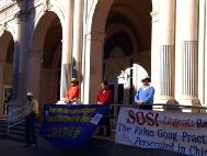 2月23日(星期日)上午10:00我们在维克多维亚(Victoria)市政府大楼前举行新闻发布会。一位市政府的工作人员听了我们的介绍,立即在签名簿上签名表示支持。一位巡逻的警官听了介绍,也明白了一切,也在签名簿上签了名。虽然没有媒体到场,我们还是用大喇叭宣读了中国无理扣押美国公民的媒体声明。