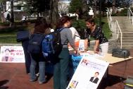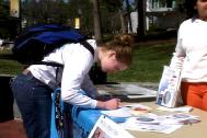 | 国际大赦向学生们介绍查尔斯.李和周雪菲被迫害的情况 | 一位学生郑重地签上自己的名字“让我们一起来结束对法轮功的人权迫害!” |