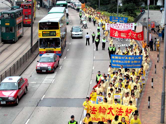 九面不同颜色写有“真善忍”、“法轮大法”等字的直立幡旗,穿插在游行队伍中,份外显眼,还有许多大小不一的横幅,既有弘扬法轮大法,也有反对23条、呼吁制止迫害和紧急救援的。800多名各地法轮功修炼者,有些手拿展板,浩浩荡荡地从湾仔入境处大楼出发,游行到政府总部。队伍整齐而祥和,游行人士沿途向路人派发传单及向往来车辆微笑挥手,吸引了不少路人的关注和善意的回报。此次游行是港府首次批准法轮功学员在大马路上进行。