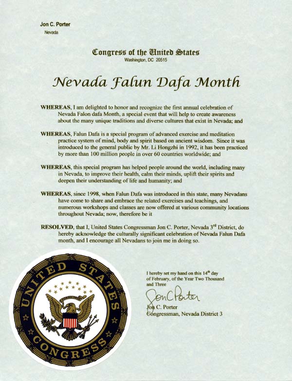 【明慧网2003年2月27日】美国内华达州众议员乔-坡特(Jon Porter)宣布2003年2月为内华达州法轮大法月。