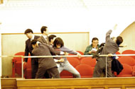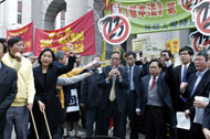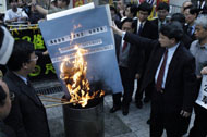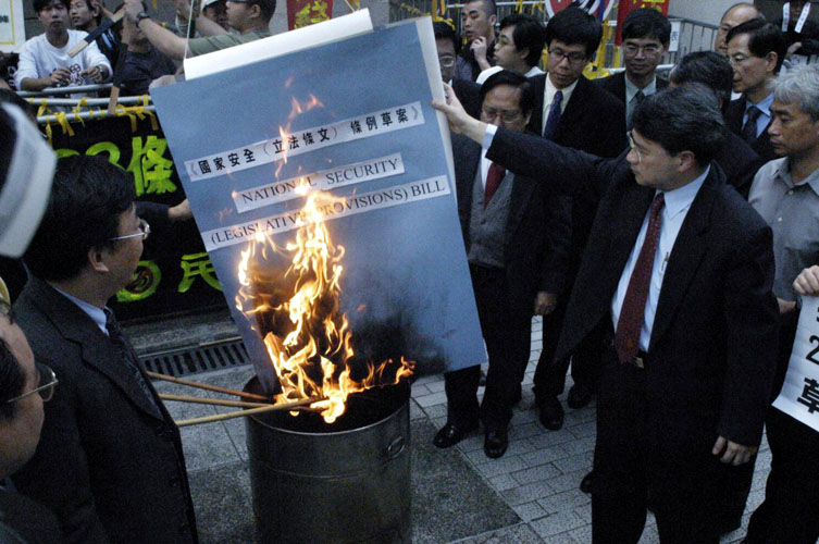 | 民主党、前线、职工盟二十多名民主派议员集体离场抗议23条立法,在立法会大楼正门外焚烧模拟23条蓝纸草的纸牌。 | |