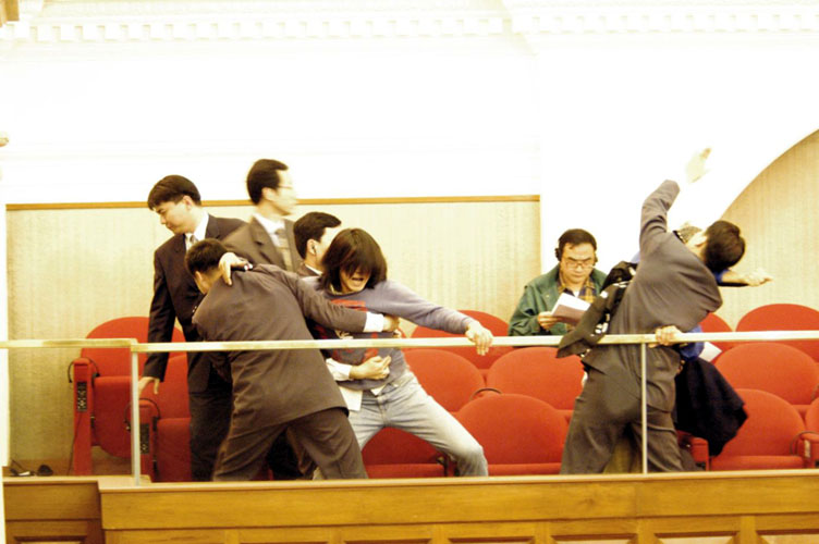 首读时,在立法会大楼公众席的几名「四五行动」包括「长毛」梁国雄等五名成员,高叫反对23条立法、要求立即撤回草案的口号及散发传单、纸碎,抗议政府提交国家安全条例草案,使会议一度受阻,五人被保安人员强行带走,各人获准以五百元自签保释,八个星期后提堂聆讯。
