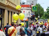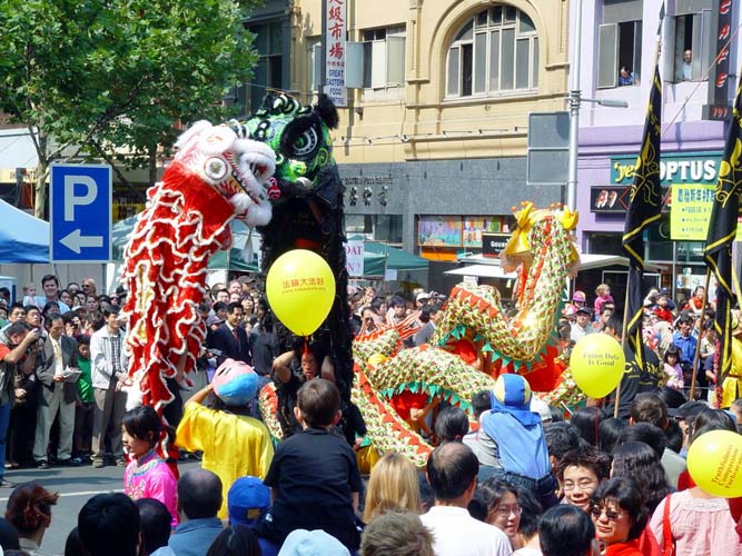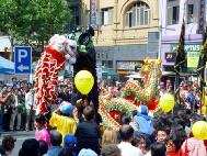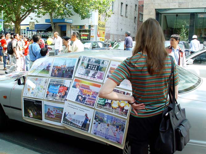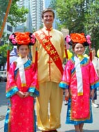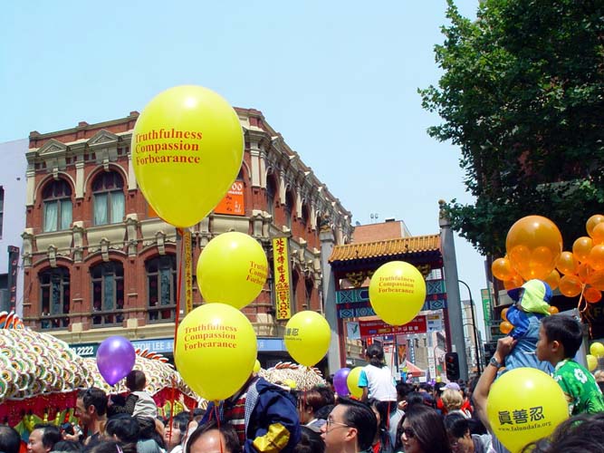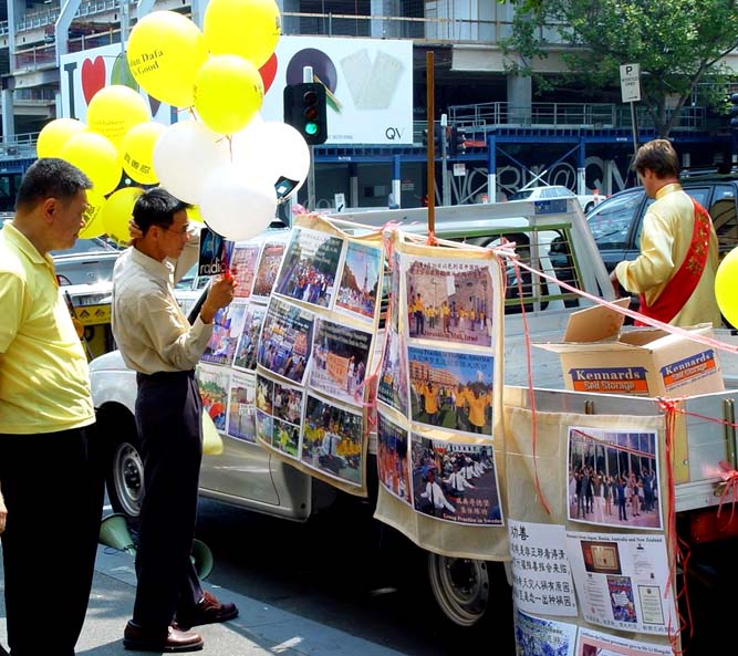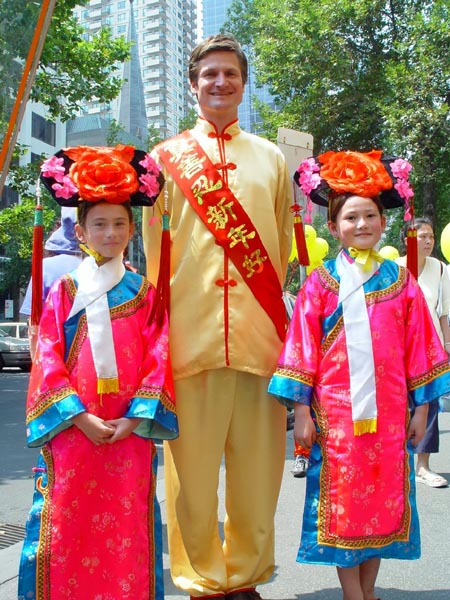 另一件引人注目的事是:有十几名西人学员身穿中国传统节日服装,肩跨红色缎带,上面写着『真善忍』『新年好』『法轮大法好』,并穿行在人群中,其中一对西人年青夫妇,女的身穿白色绸缎旗袍,男的身穿黄色中式绸缎褂非常漂亮,许多华人都争相与他们俩合影留念。