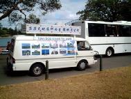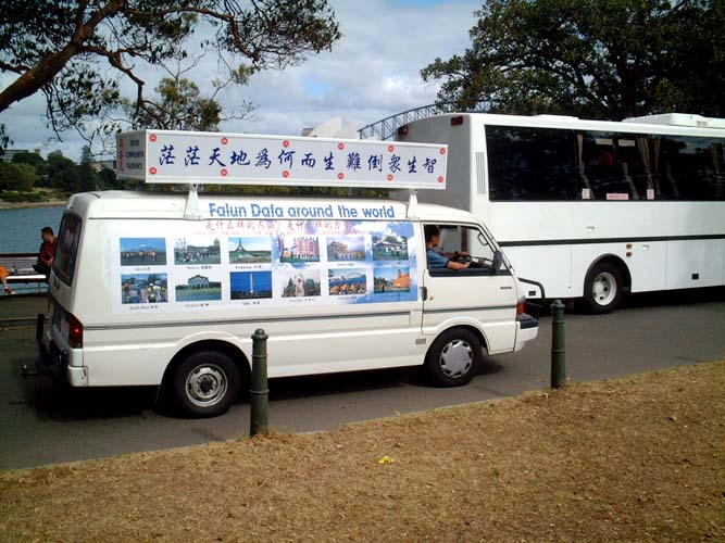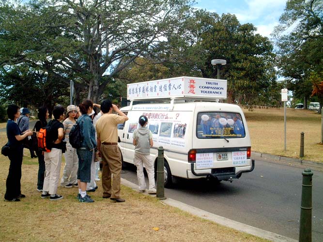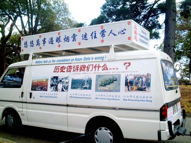 2003年2月1日,美国圣地亚哥市举办中国传统文化节,法轮功学员也不失时机积极申请了展位,借此机会向众多游人洪法和讲清真相。