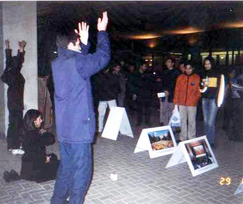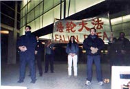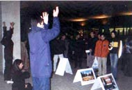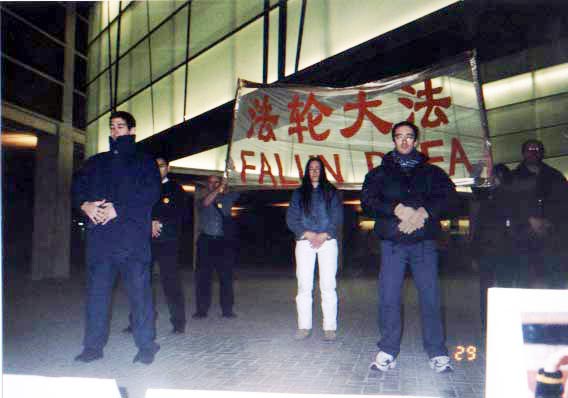 有一个大约十一、二岁的小学生站在队伍外边说:“我才不相信这些迷信。”看到生长在海外的少年儿童都被江氏邪恶集团的谎言所毒害,我们的心都在隐隐作痛,学员耐心地给他讲法轮大法是科学,而且是更高的科学,现在科学家已经对法轮大法修炼者的血液细胞进行研究,发现细胞已经发生了巨大的变化……我们看到这个小学生的神情由开始时的固执与不屑,到渐渐地缓和,进而认真倾听到最后他说:“那我也想学法轮功。”我们为此感到欣慰。有一对夫妻带着孩子来到剧场,一位学员递给那位妻子一份真相小册子,妻子一看是法轮功,赶忙叫丈夫过来看,谁知丈夫一看,便一把抢过去扔在地上,另一位学员看到后,赶快过去捡了起来,诚恳地对他们说:“你们千万不要扔啊,这是非常珍贵的,法轮大法是佛法,你们要好好珍惜,记住真善忍,你的一生都会受益无穷的。”那位妻子责怪地瞅了丈夫一眼,转过头来对学员说:“我信佛,我相信你说的,你放心,我会好好读这个(小册子)的。”还有的人拿到资料后,一看是法轮功真相,就又返回来问可不可以为朋友要一本,在拿到资料后,非常感谢地走了。