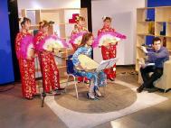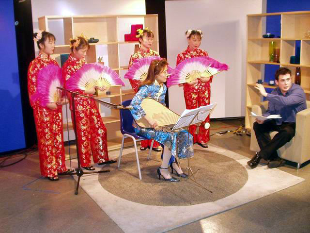 | 大法弟子在牛津一所学校的新春晚会上表演扇子舞 | 参加演出的大法弟子于牛津市长及市府贵宾合影 | 大法弟子在电视台的演播室 |