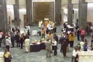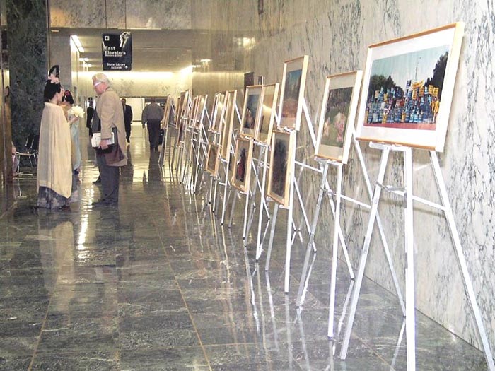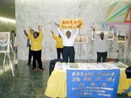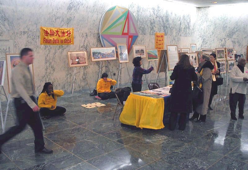 图片展和答谢会的举办地点都在“交通要塞”上,是各级官员和工作人员进出的必经之地。25幅图片展示着大法的美好和庄严,有几幅是大法弟子面对迫害正气浩然、无私无畏的写实。中英文的“法轮大法好”非常醒目。在图片展举办的同时,不同种族的法轮功学员一遍又一遍地演示着功法。一位州议员深有感触地说:“看到这么多西方人也炼法轮功,真是很好,以前以为只是亚洲人的文化。”