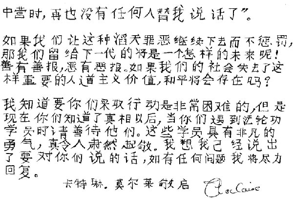 2002年10月被强行送到临沂市洗脑班进行洗脑,6天6夜不让睡觉。后被送到临沂市看守所非法关押至今,从精神到肉体上都受到了非人折磨,现身体状况很差。据悉,对她的非法判刑材料已经送交到临沂市检察院。