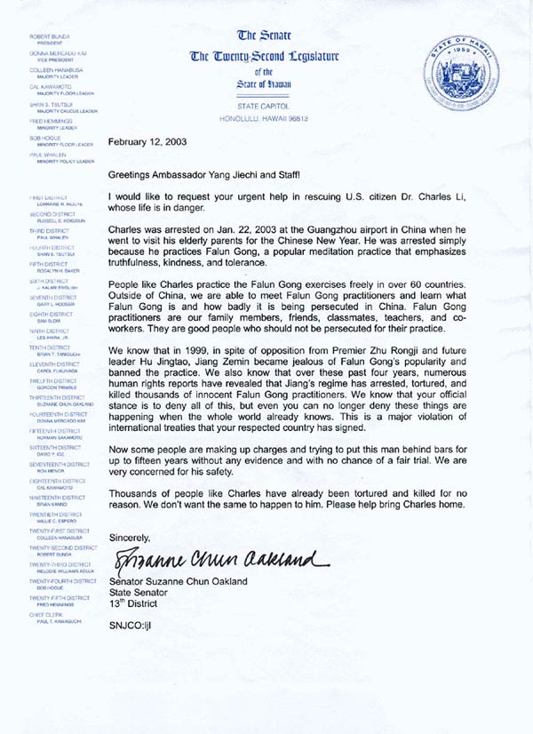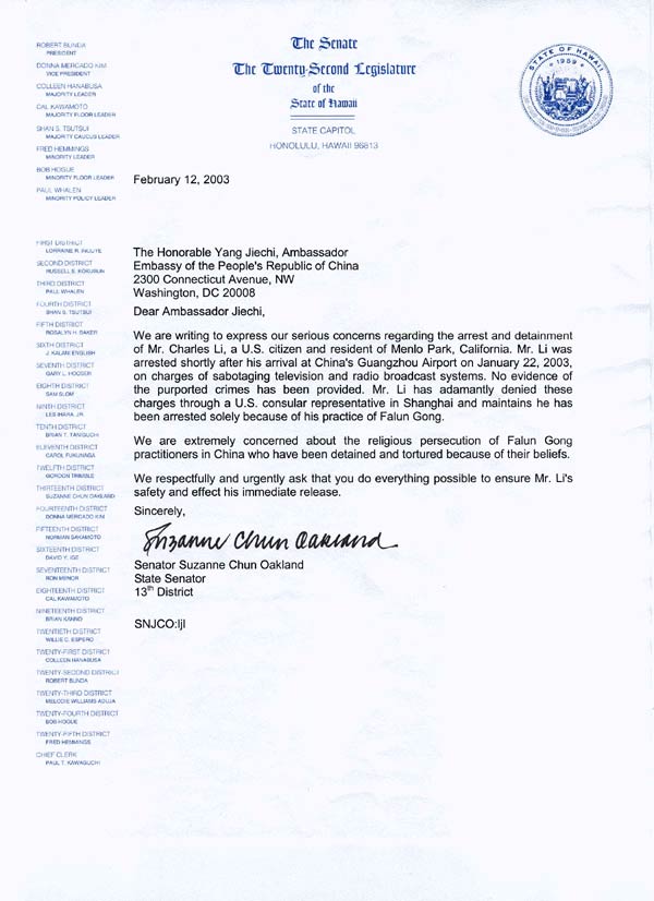 我们向阁下致信表达我们对美国公民,加州门罗帕克居民查尔斯李先生被逮捕和关押一事的深切关注。李先生是于2003年1月22日抵达广州机场不久被逮捕的,被指控破坏电视广播系统。[中方]对这一号称的罪名没有提供任何证据。李先生通过美国驻上海领馆代表坚决否定了对他的指控,并表示他被捕是仅仅因为他修炼法轮功。