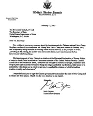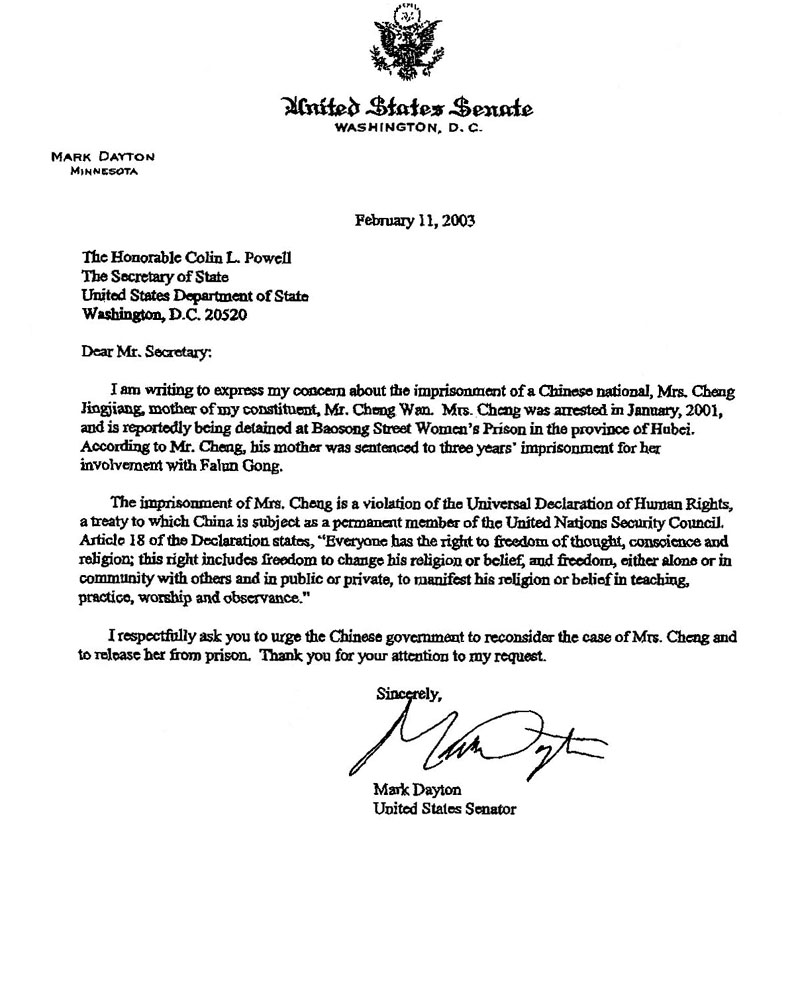 我写这封信是为了表达我对本州选民万成先生的母亲陈静江女士被关押一事的关注。陈女士于2001年1月被捕,据消息说被拘留在湖北武汉市宝丰路女子监狱。据万成先生讲,他的妈妈因修炼法轮功被判三年劳教。