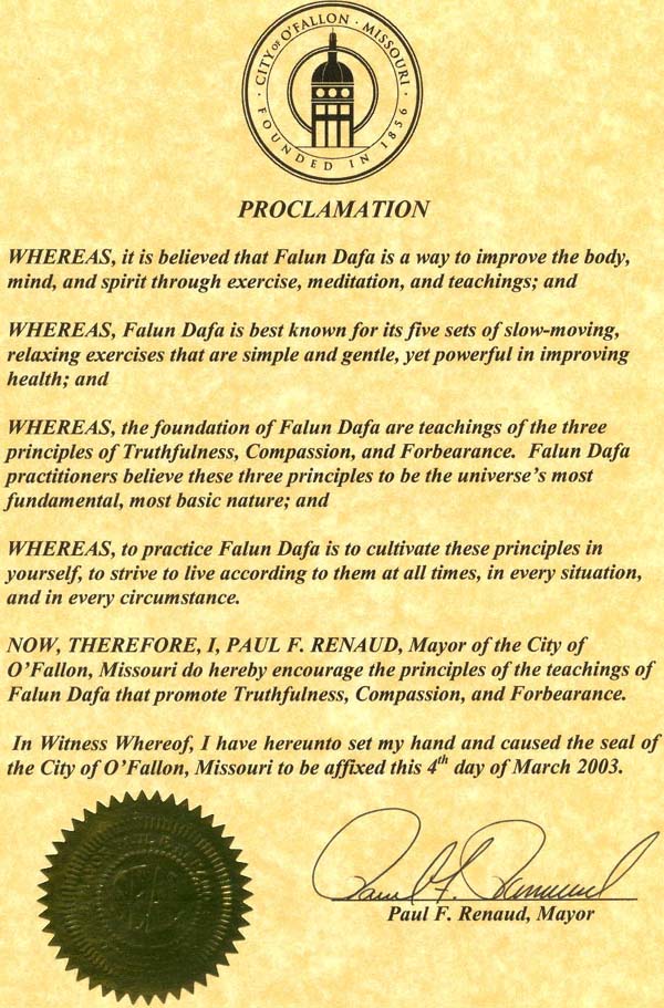 因此,我,密苏里州奥法隆市市长保罗.瑞那德特此鼓励提倡“真、善、忍”的法轮大法的法理。