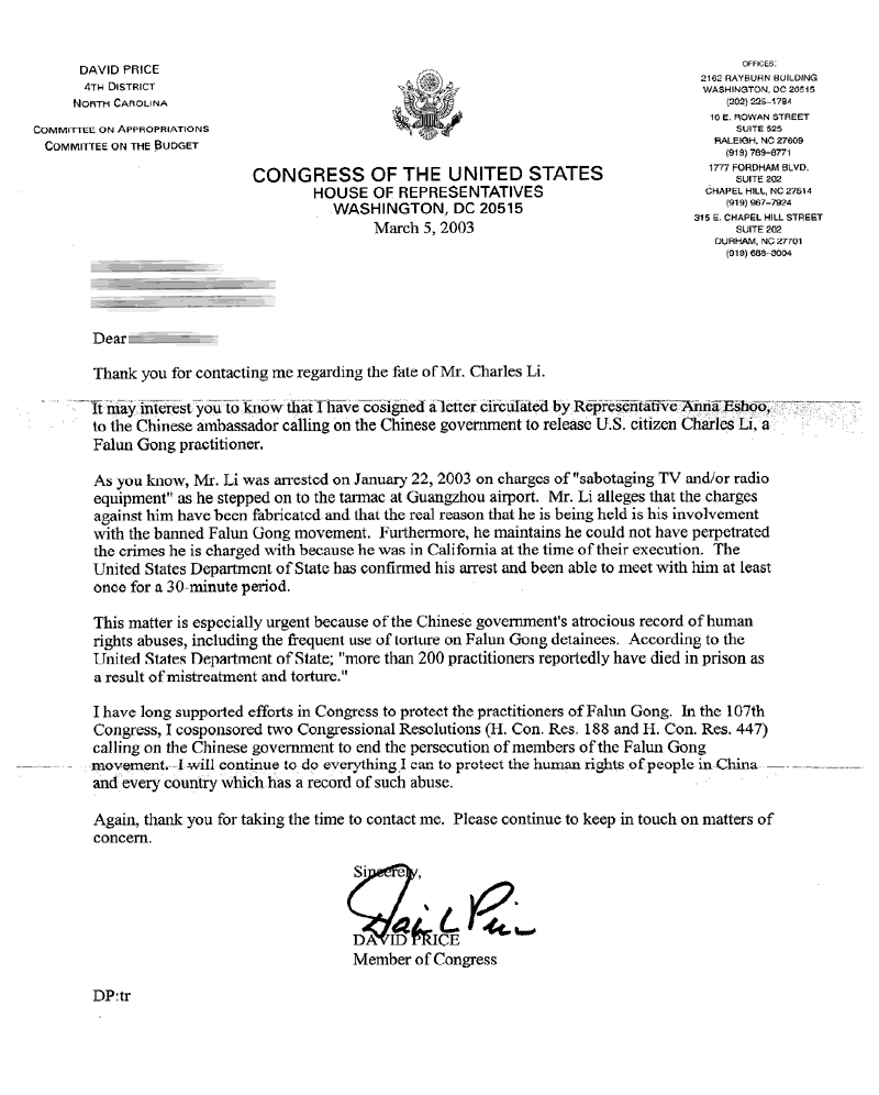 正如你所了解的,李先生于2003年1月22日在广州机场即遭到拘捕,被指控“破坏广播电视设备”。然而李先生说这些指控是捏造的,他被扣留的真实原因是他修炼被[中国政府]禁止的法轮功。而且,他说自己不可能与所指控的事件有关,因为当时他身在加州。美国国务院已经证实了他的被捕,并且曾至少与他有一次30分钟的会面。