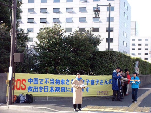 黄色的布幅上鲜艳的红色SOS大字及蓝色的呼吁日本政府救援在中国被非法关押的金子容子的大型横幅分外引人注目,日本各地到国会办事的人员络绎不绝,许多议员、官员和行人都接受了资料,并主动签名营救金子容子。相信这一请愿会再一次迅速把营救金子容子的信息传遍日本全国。