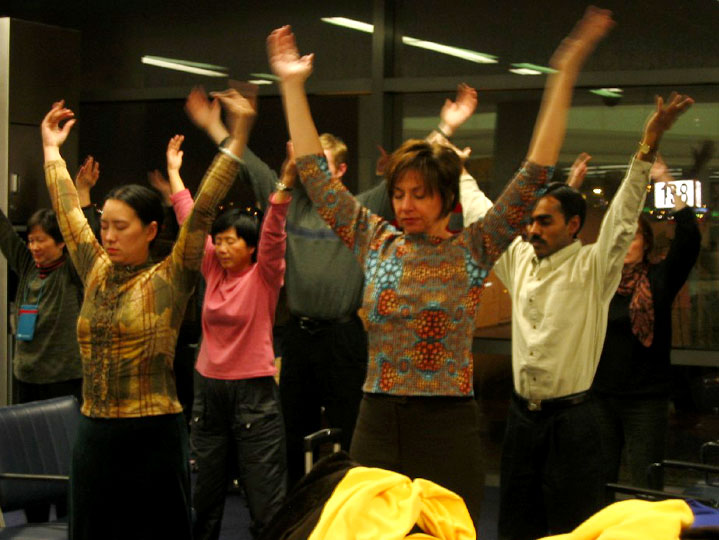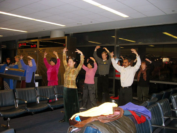 【明慧网2003年3月15日】3月13日,美国和加拿大部份大法弟子起程前往日内瓦参加联合国人权会议期间法轮功的和平呼吁活动。在美国新泽西纽沃克国际机场转机时,法轮功学员伴随着悠扬的炼功音乐炼功,给喧闹的机场带来了宁静祥和的气氛。很多旅客静静地观看着。这是一位旅客拍下的照片。