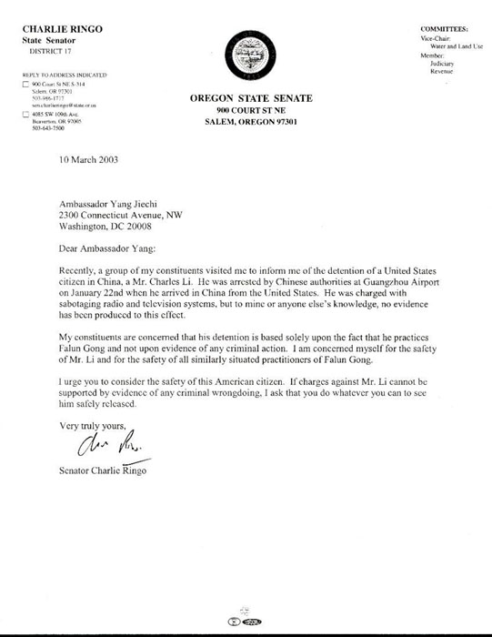 我的选民对于他仅仅由于修炼法轮功而不是由于有任何犯罪行为的证据而被捕非常关注。我自己关注着李先生和所有处于类似情形中的法轮功学员的安全。在中国,很多这样的学员仅仅由于他们的信仰而被监禁甚至受到酷刑折磨。