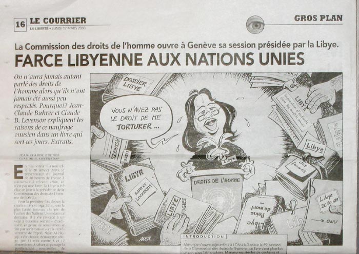 【明慧网2003年3月18日】日内瓦信报报道- 人们从来都没有象现在这样对人权说的这么多,但是也从来没有象现在这样对人权如此地不尊重。为什么呢?近日出版的《联合国反人权?》一书,讲述了联合国落入险境的原因。该书由记者让-克罗德.布梅和他的妻子克罗德 B.乐万森合著。下面是该书的片断。在2003年1月20日,法国电视二台的晚间20点新闻中,主持人披露:『这可不是一个玩笑,利比亚今天被选为联合国人权委员会的主席国。』