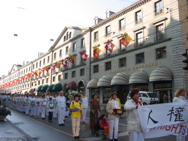 法轮功在日内瓦的游行队伍瑞士联邦议会议员兼绿党主席帕特黑斯·穆尼先生在游行队伍中日内瓦市议会议员玛丽亚·保罗·布朗沙库兹夫人(右)、法国绿党亚洲委员会主席让-马克·布鲁莱先生(左)在游行队伍中。
