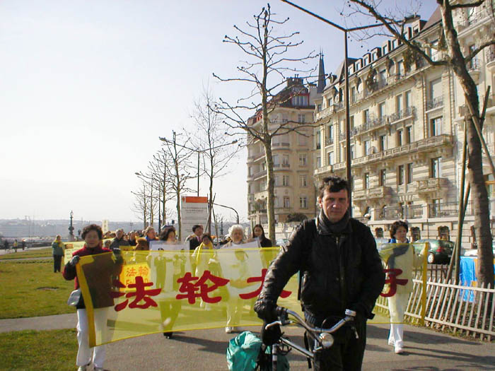 【明慧网2003年3月18日】2003年3月17日,正值联合国人权会议的第一天,逾千名来自世界40多个国家的部份法轮功学员在日内瓦举行大游行,呼吁世界各界人士,帮助停止中国江氏政治流氓集团镇压法轮功。瑞士联邦议会议员兼绿党主席帕特黑斯·穆尼先生,联邦议会议员尼尔·德·达尔戴克、日内瓦市议会议员玛丽亚·保罗·布朗沙库兹夫人、法国绿党亚洲委员会主席让-马克·布鲁莱先生,参加了游行。