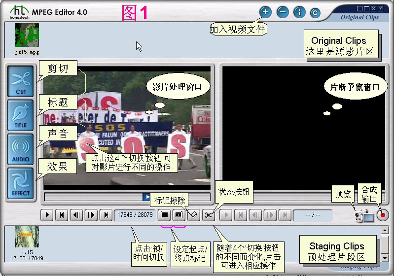honestech MPEG Editor 4.0是比较好的mpeg编辑软件,只有9M,可以进行影片片段的任意剪接组合、添加标题文字、影片配音、画面效果处理等,软件界面左边4个按钮就是进行这4项操作的(图1),非常简单。这里只用到剪切和添加文字。软件网站只能下载demo(试用)版,输出影片只允许5分钟,但对我们来说已经足够了。咱们来看看怎么用: