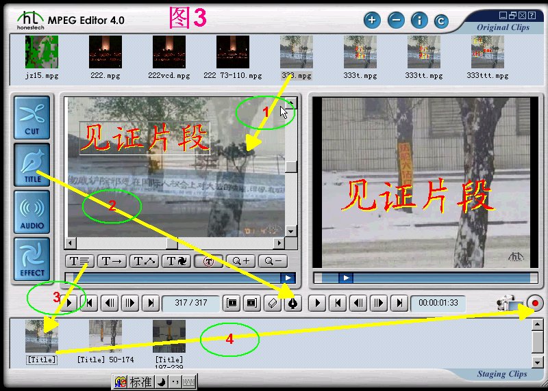 图3 步骤说明:1.把粗片333.mpg拖入左窗口---2.进入‘标题’状态(按下‘标题’按钮)---3.修改标题文字---4.输出