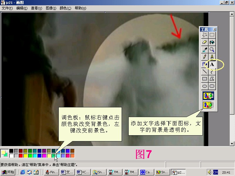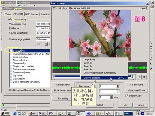 对‘画图’和TMPGEn的使用补充如下:1. 关于快速获得704x576图片方法:在TMPGEn载入mpeg(avi)文件,在‘设定’(setting)里进入到图6的位置,获得需要的画面。然后打开‘画图’,粘贴,即刻得到352x288图片。在‘画图’>拉伸/扭曲>: 水平和垂直拉伸值同时改为200%即可。