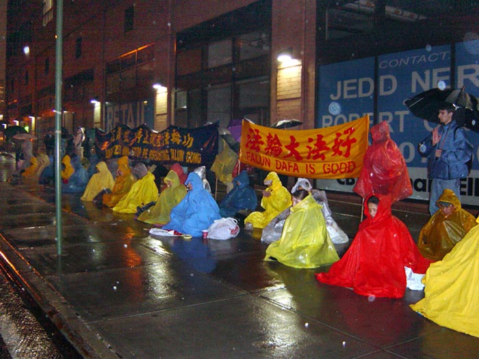 【明慧网2003年3月22日】美国东部时间三月二十日晚,大纽约地区部分法轮功学员再次来到中领馆前,对中国无理拘捕美国公民李祥春,并将进行所谓审判表示强烈的谴责。尽管当晚雨下得很多大,学员们坚持发正念,请愿活动自六点半持续至九点一刻。自由亚洲电台作了电话采访。