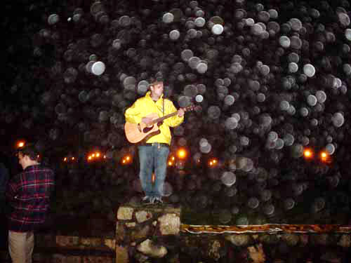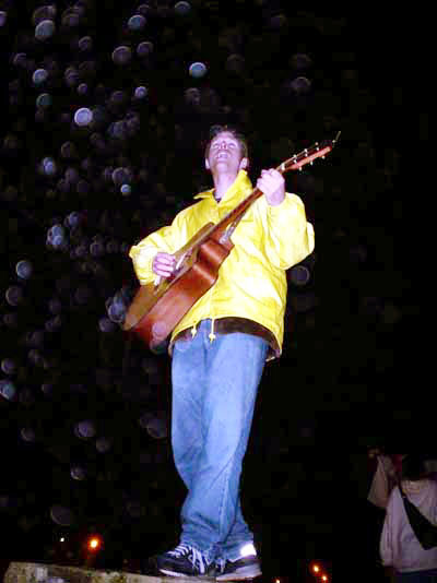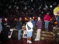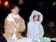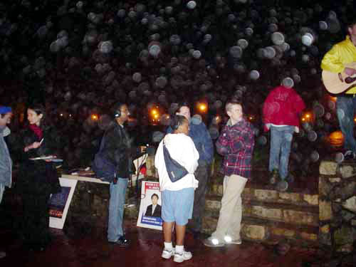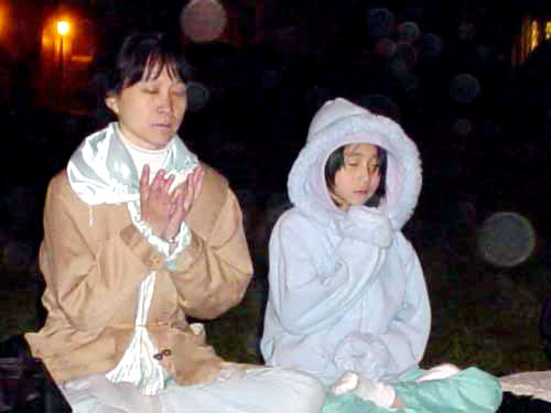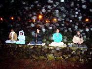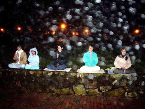 美国攻打伊拉克的战争在前晚开始,集会附近的街上有支持和反对战争的示威者。双方都喊着口号,造成相当大的噪音。但是,在当晚结束时,人们变得比较平和起来。当我们发正念时,一些人甚至过来和我们一起盘腿坐下。示威者们甚至中止呼喊,听一位西方学员唱营救查尔斯-李的歌曲。人们还走过来在请愿书上签名。